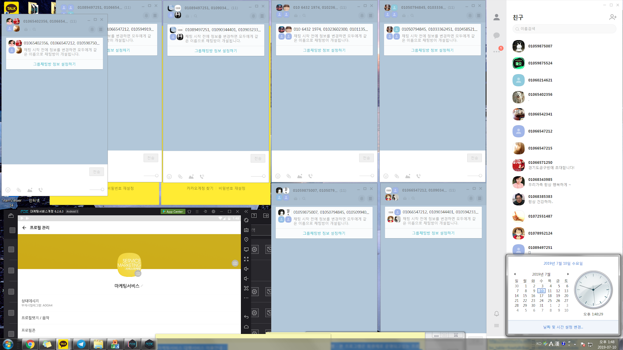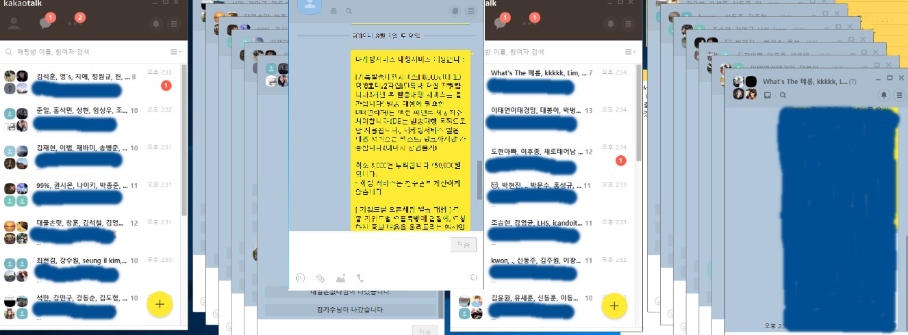 [카톡발송대행서비스] 8,000건에 10명(8초대/2작업)단톡방 작업 진행합니다.(개인 톡 발송대행 서비스는 불가합니다) 발송 대행에 필요한 DB(연락처)는 엑셀 파일로 제공해주셔야합니다.(DB는 발송대행 목적으로만 사용됩니다.) 마케팅서비스 발송 대행 서비스는 텍스트, 링크까지만 가능합니다.(이미지 삽입불가)